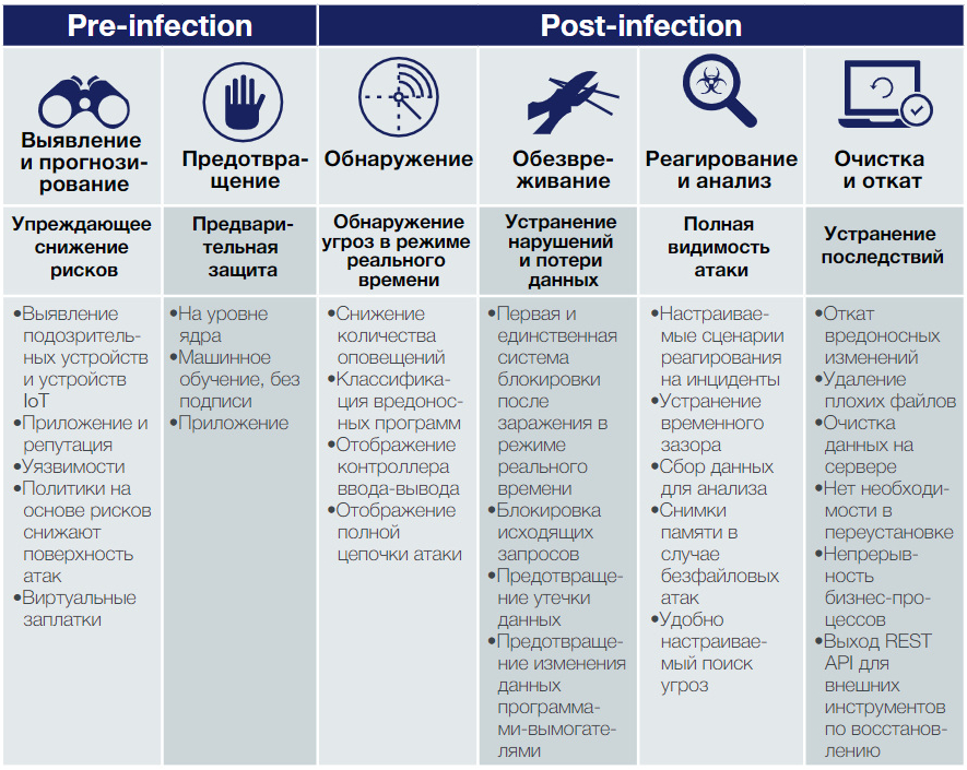 Решение FortiEDR включает функции выявления и снижения рисков, с помощью которых сотрудники отделов безопасности могут в режиме реального времени проактивно управлять подозрительными устройствами, устройствами IoT и приложениями, а также устранять уязвимости системы или приложений. Модуль защиты от вредоносного ПО на базе ядра с технологией машинного обучения FortiEDR эффективно противостоит вредоносному ПО.В случае возникновения инцидента безопасности FortiEDR защищает данные на скомпрометированных устройствах и в режиме реального времени обезвреживает угрозы, предотвращая кражу данных и шифрование программами-вымогателями. Затем автоматизированные функции реагирования на инциденты и устранения последствий откатывают вредоносные изменения состояния конечных точек.